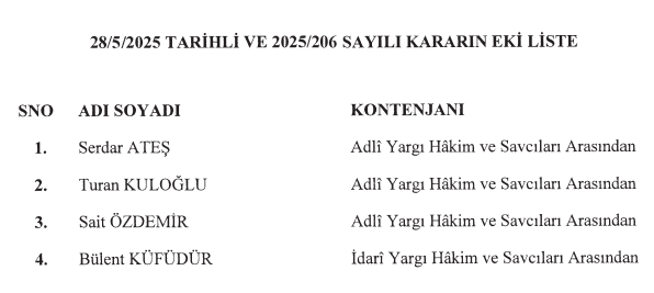 Adalet Bakanlığı Hukuk Hizmetleri Genel Müdürü Serdar Ateş, Ankara Bölge İdare Mahkemesi Başkanı Bülent Küfüdür, Adalet Bakanlığı Personel Genel Müdürü Turan Kuloğlu ve İstanbul Adalet Komisyonu Başkanı Sait Özdemir yeni Hakim ve Savcılar Kurulu (HSK) üyesi olarak atandı.