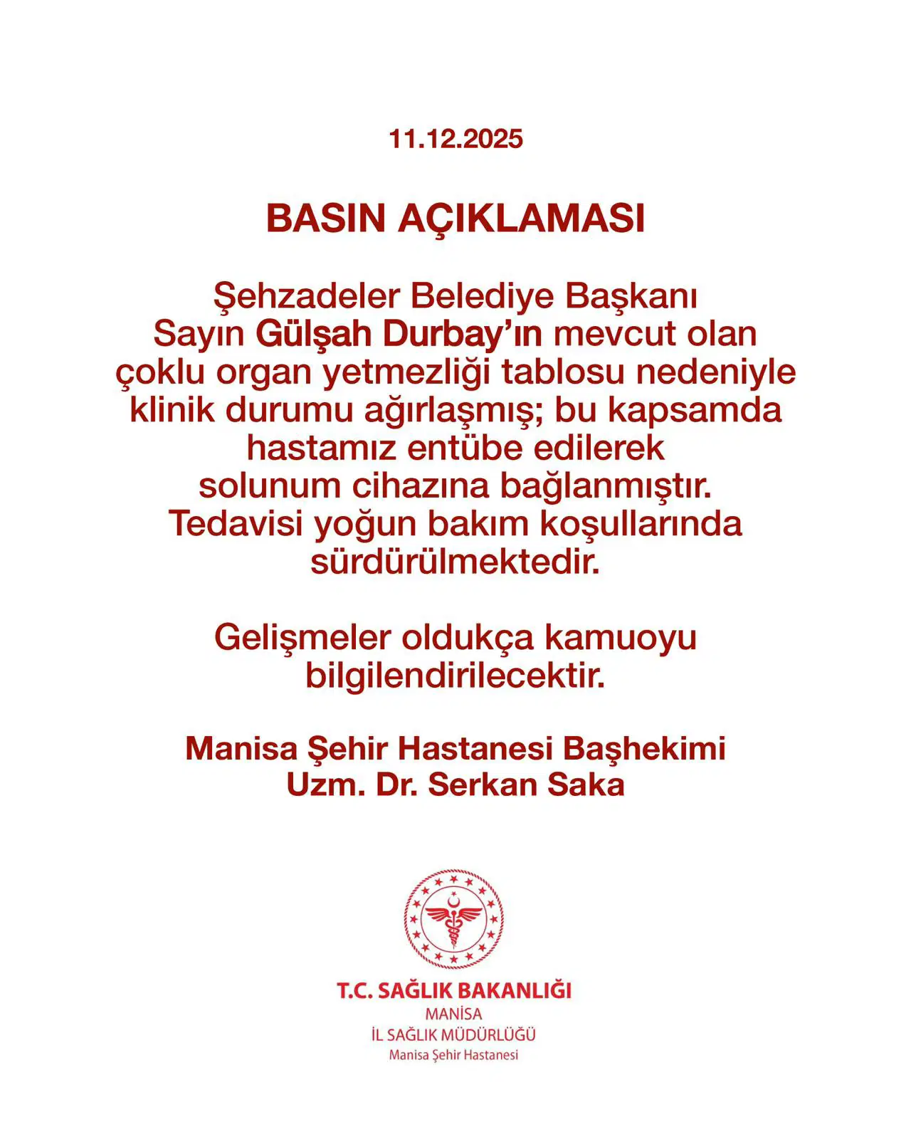 Manisa Şehir Hastanesi’nden yapılan açıklamada “Şehzadeler Belediye Başkanı Sayın Gülşah Durbay’ın mevcut olan çoklu organ yetmezliği tablosu nedeniyle klinik durumu ağırlaşmış, bu kapsamda hastamız entübe edilerek solunum cihazına bağlanmıştır. Tedavisi yoğun bakım koşullarında sürdürülmektedir. Gelişmeler oldukça kamuoyu bilgilendirilecektir” dendi.
