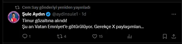 Şule Aydın, gazeteci Timur Soykan’ın gözaltına alındığını yazdı.Aydın, Soykan’ın Vatan Emniyet’e götürüldüğünü bildirirken, gerekçenin X paylaşımları olduğunu bildirdi.