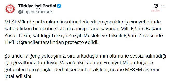 Mesleki Eğitim Merkezleri (MESEM) uygulamasına karşı Tekin’i protesto eden öğrencilerden 17 TİP üyesinin gözaltına alındığı bildirilen açıklamada, “MESEM’lerde patronların insafına terk edilen çocuklar iş cinayetlerinde katledilirken bu ucube sistemi cansiparane savunan Milli Eğitim Bakanı Yusuf Tekin, katıldığı Türkiye Yüzyılı Mesleki ve Teknik Eğitim Zirvesi’nde TİP’li Öğrenciler tarafından protesto edildi. Şu anda 17 genç yoldaşımız, sıra arkadaşlarının ölümüne sessiz kalmadığı için gözaltında tutuluyor. Vatan’daki İstanbul Emniyet Müdürlüğü’ne götürülen tüm gençler derhal serbest bırakılsın, ucube MESEM sistemi iptal edilsin” denildi.