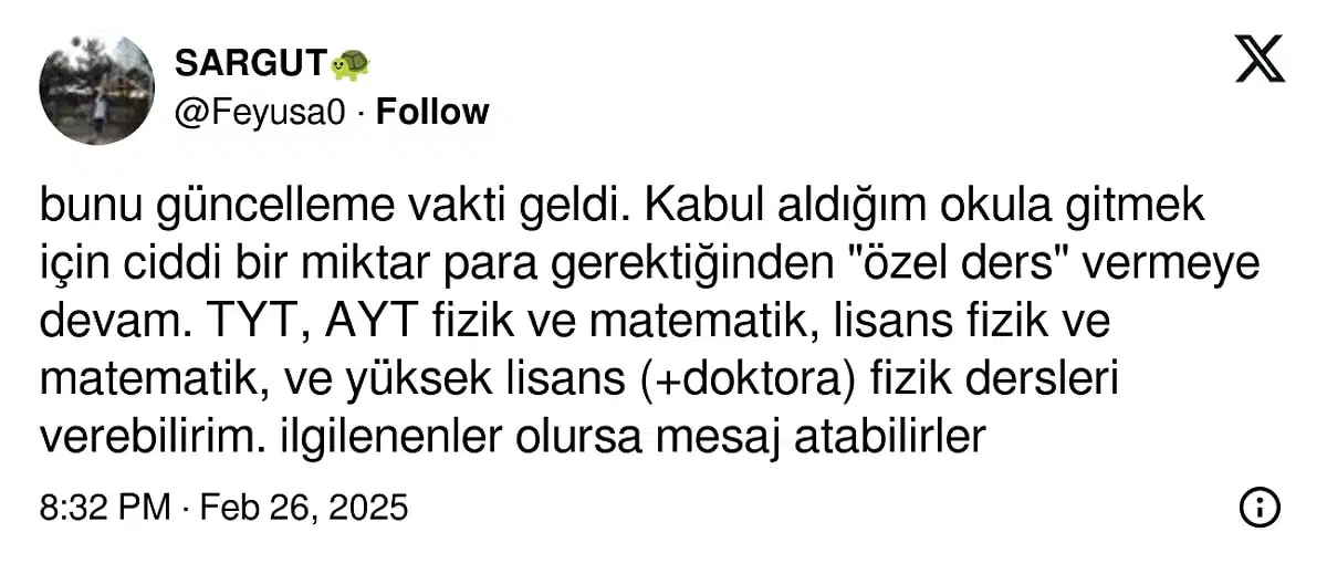 Şubat ayında bir paylaşım yapan Sargut, ‘Kabul aldığım okula gitmek için ciddi bir miktar para gerektiğinden ‘özel ders’ vermeye devam. TYT, AYT fizik ve matematik, lisans fizik ve matematik, ve yüksek lisans (+doktora) fizik dersleri verebilirim. ilgilenenler olursa mesaj atabilirler’ mesajını paylaşmıştı.