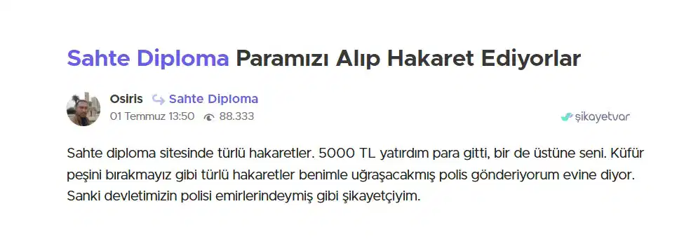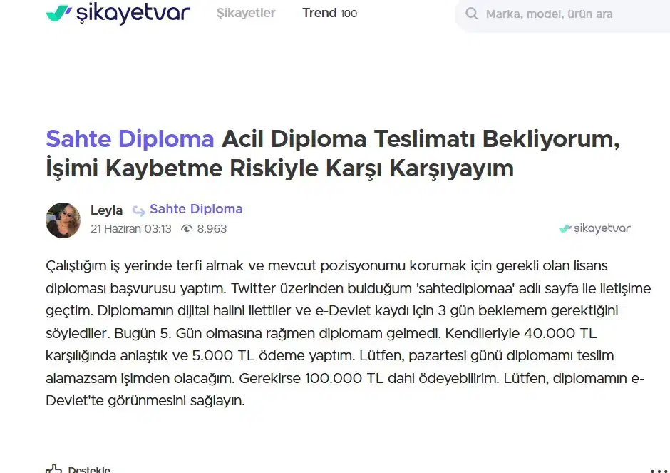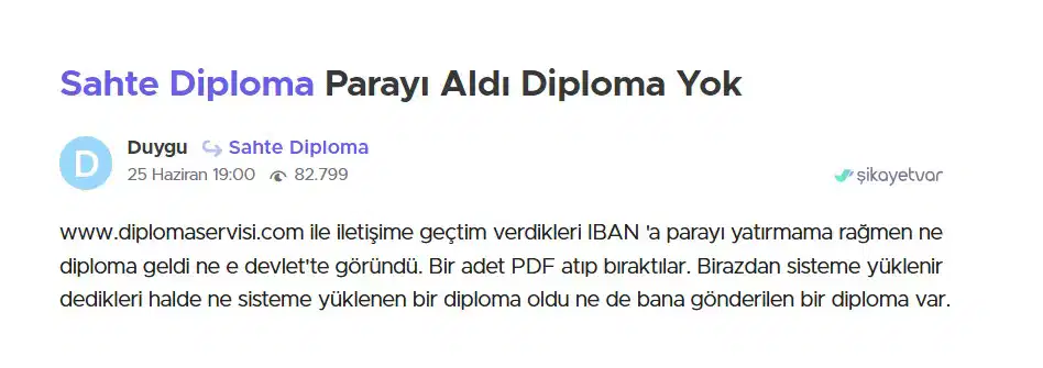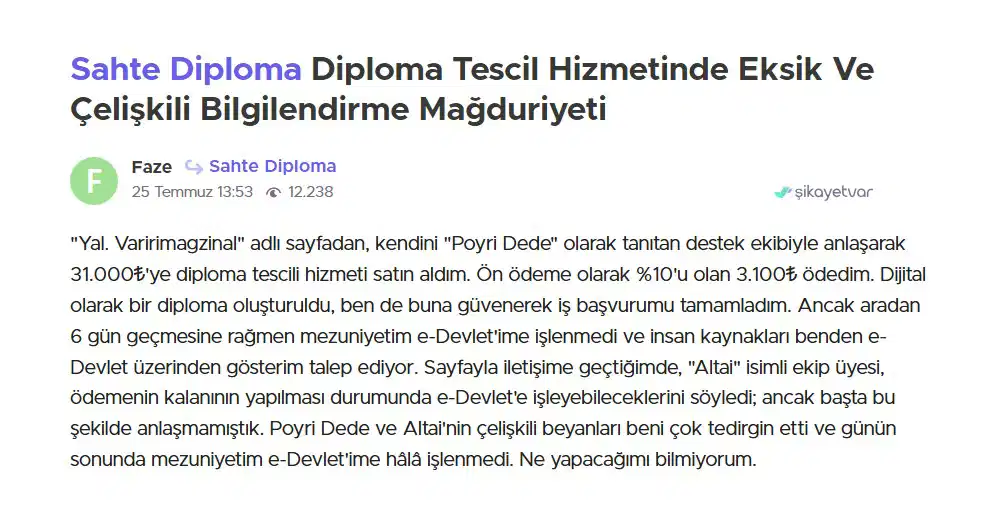 Ortaya çıkan tablo trajikomik: Sahte diploma almaya çalışanlar dolandırıldıklarını belirterek şikâyet sitelerine başvuruyor. Kimileri “aldatıldım” diyerek parasını geri istiyor, kimileri “e-Devlet’e işlemedi, bir şans daha verin” diyerek suçta ısrar ediyor.