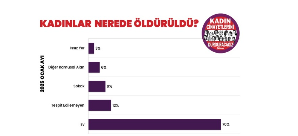 Bu ay kadınların yüzde 25’i evli olduğu erkek tarafından öldürüldü. Kadınların 11’i evinde, 2’si sokakta, 1’i ıssız bir yerde, 1’i işyerinde ve 1’i okul önünde katledildi. Bu ay öldürülen kadınların yüzde 69’u evlerinde öldürüldü.