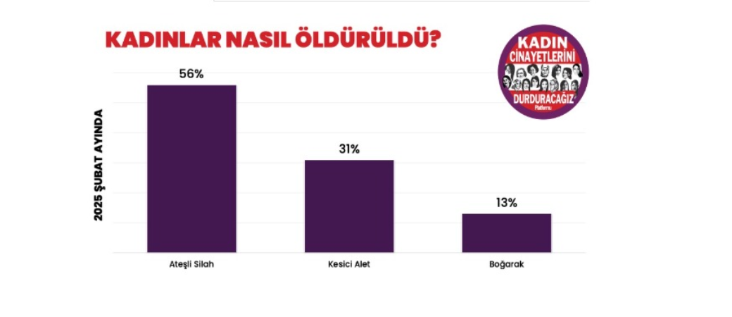 Bu ay öldürülen kadınların 9’u ateşli silahlarla, 5’i kesici aletle, 2’si boğularak öldürüldü. Bu ay öldürülen kadınların yüzde 56’sı ateşli silah ile öldürüldü.