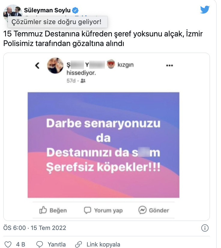 15 Temmuz’da toplumsal medyadan küfürlü bir yazı paylaşan şahıs gündem olmuştu. Şahsın, İzmir polisi tarafından yakalandığını duyuran İçişleri Bakanı Süleyman Soylu, Twitter hesabından yaptığı paylaşımda şu tabirleri kullandı: