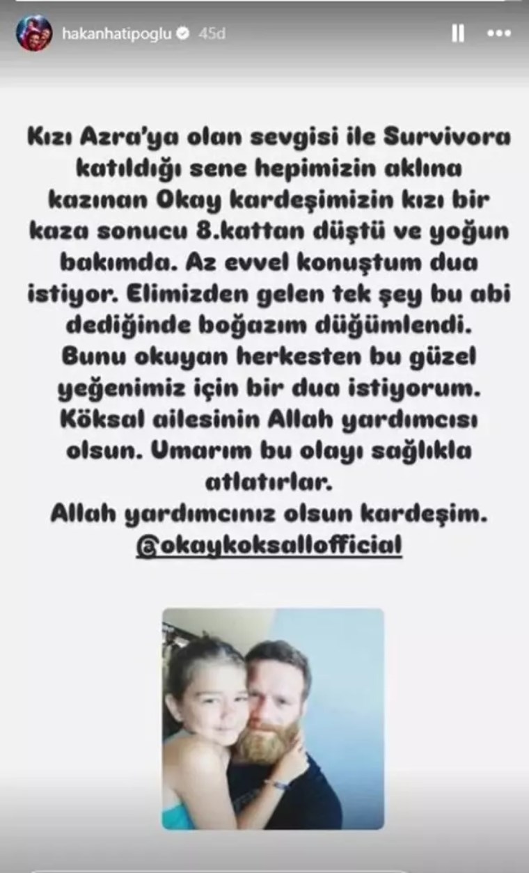 Hatipoğlu paylaşımında “Kızı Azra’ya olan sevgisi ile Survivora katıldığı sene hepimizin aklına kazınan Okay kardeşimizin kızı bir kaza sonucu 8. kattan düştü ve yoğun bakımda. Az evvel konuştum dua istiyor. Elimizden gelen tek şey bu abi dediğinde boğazım düğümlendi. Bunu okuyan herkesten bu güzel yeğenimiz için bir dua istiyorum. Köksal ailesinin Allah yardımcısı olsun. Umarım bu olayı sağlıkla atlatırlar. Allah yardımcınız olsun kardeşim” ifadelerini kullandı.