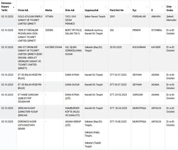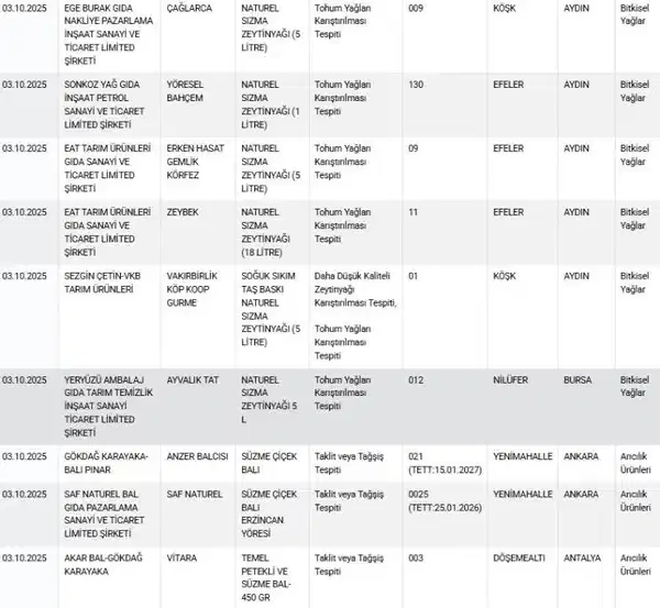 Tarım ve Orman Bakanlığı, 3 Ekim 2025 tarihinde yeni taklit veya tağşiş yapılan gıdaların listesini duyurdu.