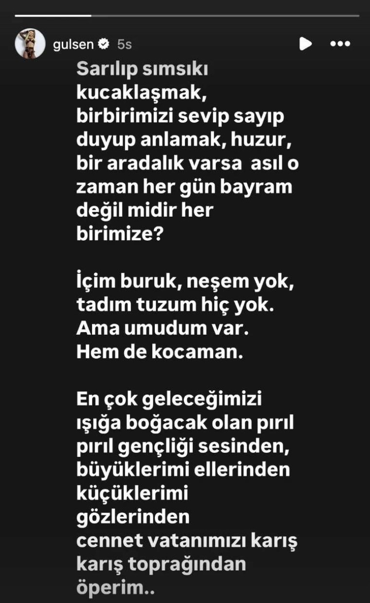Gülşen, “Sarılıp sımsıkı kucaklaşmak, birbirimizi sevip sayıp duyup anlamak, huzur, bir aradalık varsa asıl o zaman her gün bayram değil midir her birimize? İçim buruk, neşem yok, tadım tuzum hiç yok. Ama umudum var. Hem de kocaman. En çok geleceğimizi ışığa boğacak olan pırıl pırıl gençliği sesinden, büyüklerimi ellerinden küçüklerimi gözlerinden cennet vatanımızı karış karış toprağından öperim…” ifadelerini kullanarak tutuklamalara dikkat çekti.