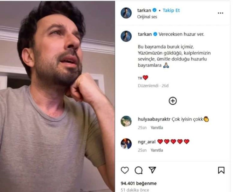 Tarkan videolu paylaşımına “Bu bayramda buruk içimiz. Yüzümüzün güldüğü, kalplerimizin sevinçle, ümitle dolduğu huzurlu bayramlara” notunu düştü.