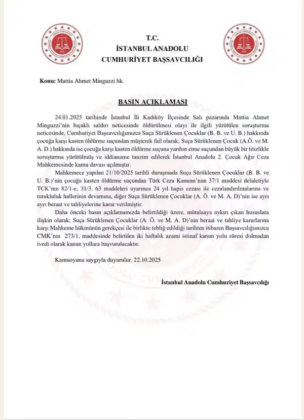 İstanbul Anadolu Cumhuriyet Başsavcılığı Mattia Ahmet Minguzzi davasında 2 sanık hakkındaki beraat kararına itiraz etti.