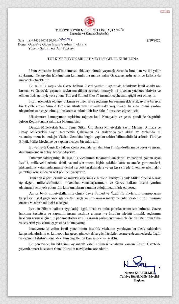 Fütursuz saldırganlığı ile insanlık vicdanının tahammül sınırlarını ve haddini çoktan aşan İsrail’i, milletvekillerimiz dahil vatandaşlarımızın hiçbir şekilde kötü muamele görmemeleri, alıkonulmuş vatandaşlarımızın derhal serbest bırakılmaları ve en kısa sürede ülkemize ulaşmaları gerektiği konusunda en sert şekilde uyarıyoruz. Tüm siyasi partilerimiz ve milletvekillerimizle birlikte Türkiye Büyük Millet Meclisi olarak üç değerli milletvekilimizin, alıkonulan vatandaşlarımızın ve Gazze halkına insani yardım ulaştırmak için yola çıkan tüm kahramanların yanında olduğumuzu ifade ediyoruz. Ayrıca başta milletvekillerimiz olmak üzere Sumud ve Özgürlük Filolarının mensuplarına karşı İsrail işgal güçlerince işlenen tüm suçların uluslararası mahkemelerde hesabının sorulmasının öncüsü ve ısrarlı takipçisi olacağız.