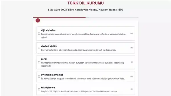 TDK’dan yapılan açıklamada, İLAUM işbirliğinde yürütülen “2025 Yılının Kelimesi/Kavramı” çalışmasında Değerlendirme Kurulu ve halktan gelen önerilerin değerlendirilmesiyle belirlenen 5 kelime/kavramın halkın oylamasına açılmıştı.