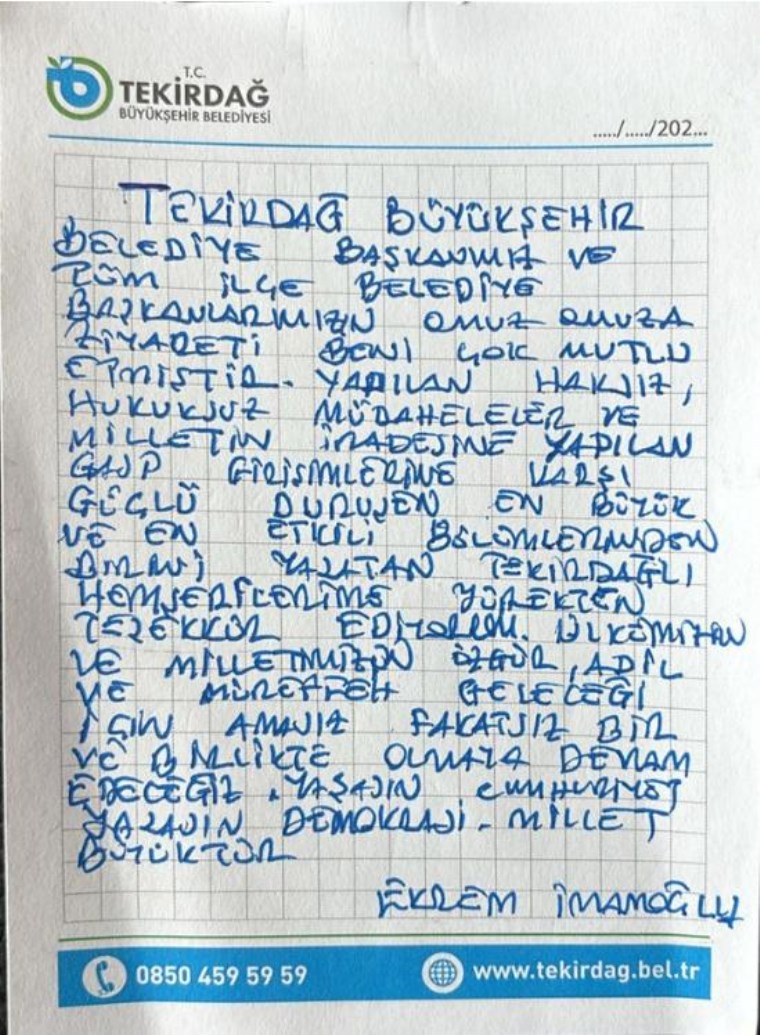 ”Tekirdağ Büyükşehir Belediye Başkanı tüm ilçe belediye başkanlarımızın omuz omuza ziyareti beni çok mutlu etmiştir. Yapılan haksız, hukuksuz müdahaleler ve milletin iradesine yönelik gasp girişimlerine karşı güçlü duruş, en güçlü ve en etkili bölümlerinden birini yaratan Tekirdağlı hemşerilerime yürekten teşekkür ediyorum. Ülkemizin ve milletimizin özgür, adil ve müreffeh geleceği için amasız fakatsız birlikte olmaya devam edeceğiz. Yaşasın cumhuriyet. Yaşasın demokrasi. Millet büyüktür.”