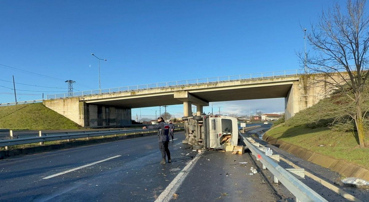 İstanbul’dan Çorlu’ya mobilya montajı yapmak için gelen Tuğrul Özen’in kontrolünü yitirdiği 34 RL 9062 plakalı kapalı kasa minibüs, refüj bariyerine çarparak devrildi.