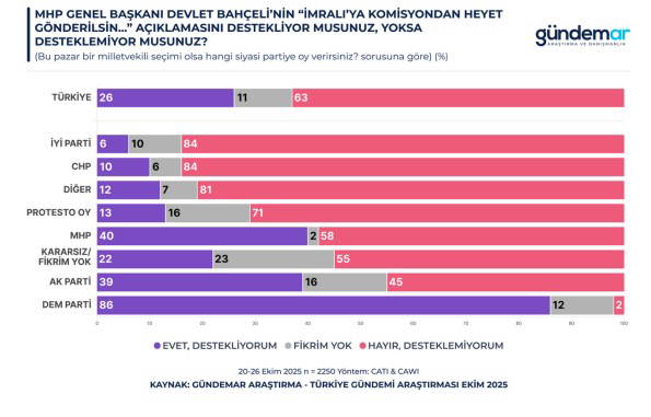 GÜNDEMAR araştırma şirketi tarafından 60 ilde 2250 kişiyle yapılan araştırmaya göre, MHP lideri Devlet Bahçeli’nin “İmralı’ya komisyondan heyet gönderilsin” açıklamasını destekleyenlerin oranı yüzde 26’da kalırken, desteklemeyenlerin oranı ise yüzde 63 düzeyinde.