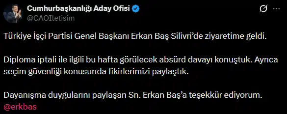 “Türkiye İşçi Partisi Genel Başkanı Erkan Baş Silivri’de ziyaretime geldi. Diploma iptali ile ilgili bu hafta görülecek absürd davayı konuştuk. Ayrıca seçim güvenliği konusunda fikirlerimizi paylaştık. Dayanışma duygularını paylaşan Sn. Erkan Baş’a teşekkür ediyorum.”