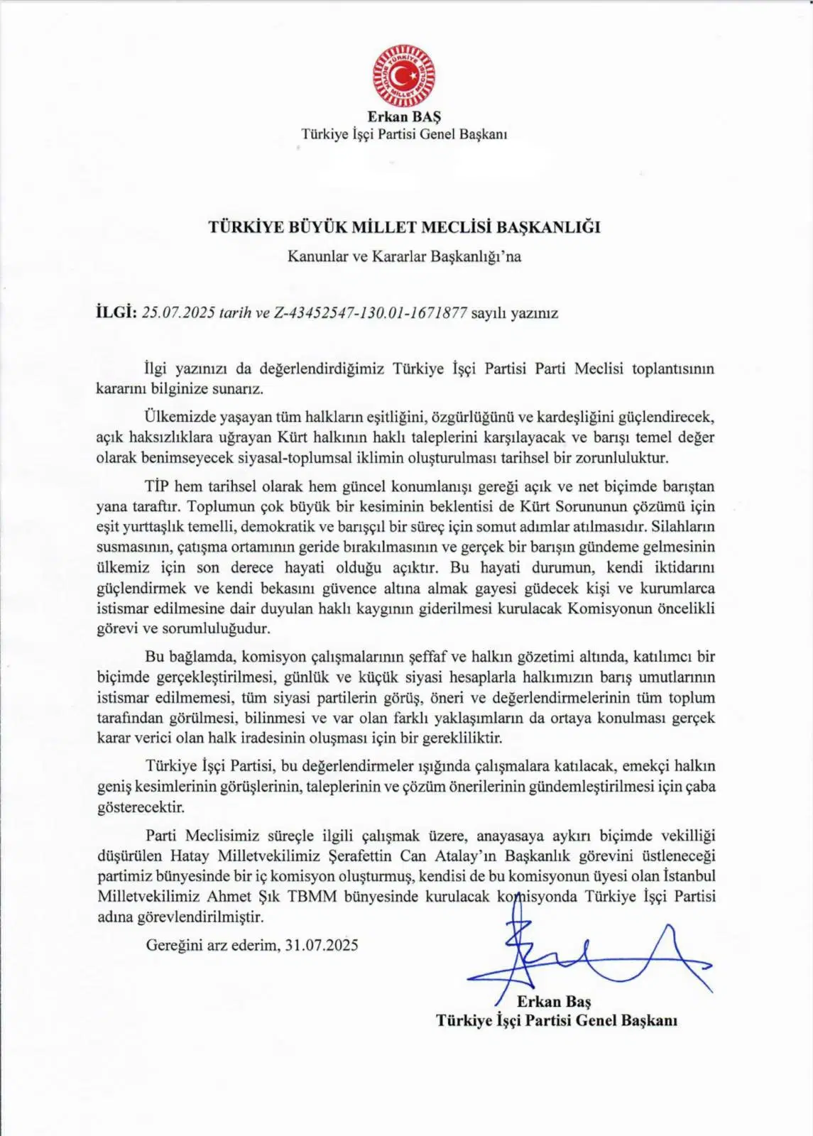 Türkiye İşçi Partisi (TİP), TBMM’de kurulacak süreç komisyonuna katılacaklarını duyurdu.