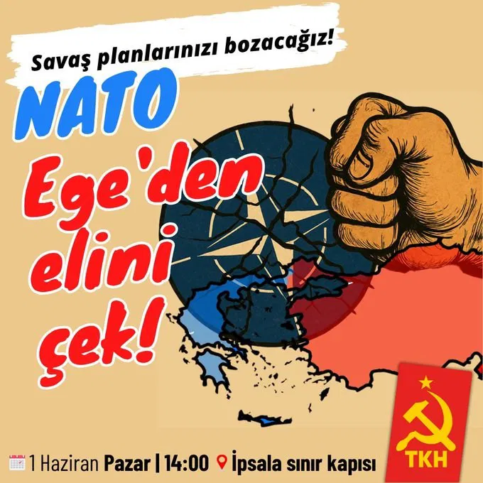 “Partimiz Türkiye Komünist Hareketi, ABD’nin Ege’de çatışmayı körükleyen adımlarına karşı emekçileri mücadeleye çağırmaktadır. Bu anlamda partimiz, Pazar günü İpsala Sınır Kapısı önünde NATO’nun planlarına karşı buluşacağını ilan eder.