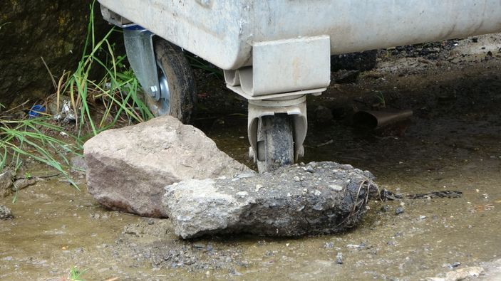 Trabzon’un Ortahisar ilçesinin Yalıncak Mahallesi’ndeki bir sitenin önünde bulunan çöp konteyneri, şimdi bilinmeyen nedenle sabitlendiği yerden çıktı.