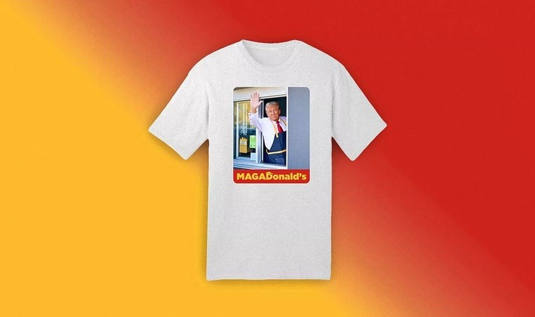 Eski ABD başkanı ve Cumhuriyetçi aday Donald Trump, bir McDonald’s fast-food restoranında yürüttüğü seçim kampanyasının ardından, üzerinde “işyeri” fotoğrafı ve zincirin adı ile kampanya sloganını birleştiren MAGADonald’s yazılı tişörtler satmaya başladı.