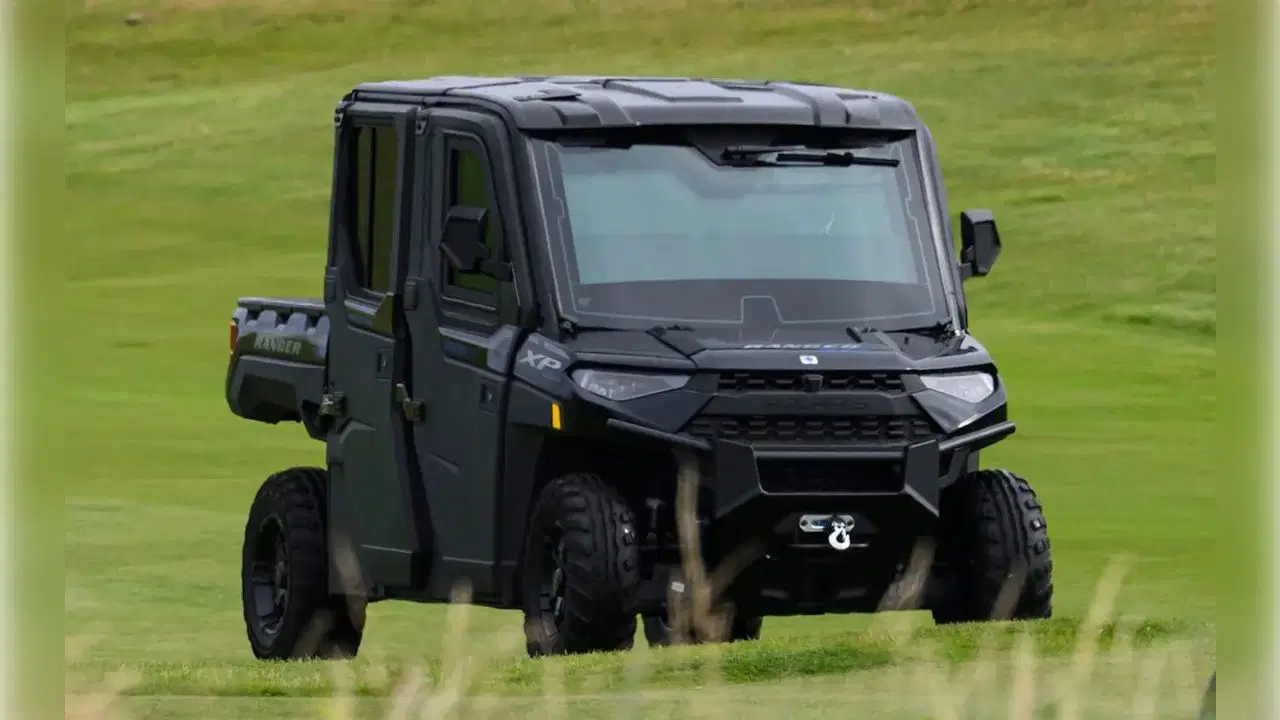 Zırhlı buggy, modifiye edilmiş bir Polaris Ranger XP’yi andırıyor. Koyu camları, güçlendirilmiş yan panelleri ve kalın arka kasasıyla dikkati çeken bu araç, balistik tehditlere karşı özel olarak güçlendirilmiş gibi görünüyor.
