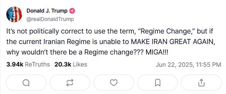 ABD Başkanı Trump, “Rejim Değişikliği’ terimini kullanmak politik olarak doğru değil, ancak mevcut İran Rejimi İRAN’I TEKRAR BÜYÜK YAPAMIYORSA, neden bir rejim değişikliği olmasın??? MIGA!!!” dedi.