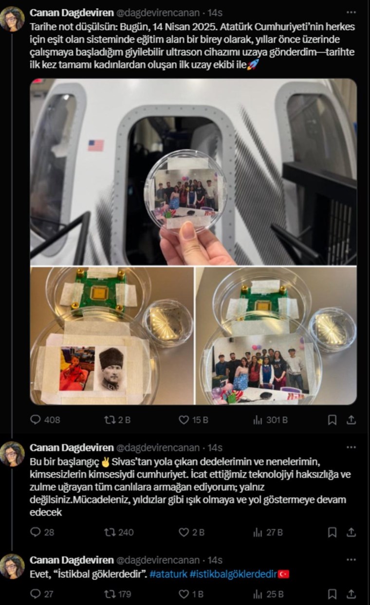 “Tarihe not düşülsün: Bugün, 14 Nisan 2025. Atatürk Cumhuriyeti’nin herkes için eşit olan sisteminde eğitim alan bir birey olarak, yıllar önce üzerinde çalışmaya başladığım giyilebilir ultrason cihazımı uzaya gönderdim. Tarihte ilk kez tamamı kadınlardan oluşan ilk uzay ekibi ile.”