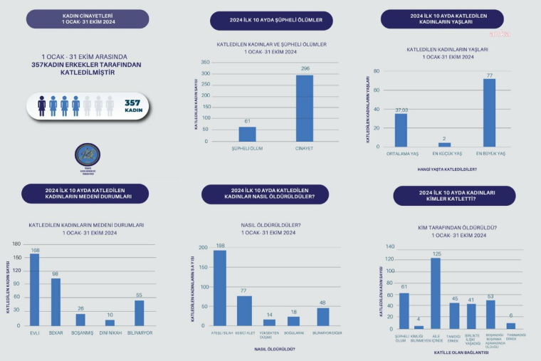 Türkiye Kadın Dernekleri Federasyonu (TKDKF), 10 aylık kadın cinayeti raporunu yayımladı. Buna göre, 1 Ocak – 31 Ekim tarihleri arasında 357 kadın, erkekler tarafından öldürüldü. Katledilen kadınların 61’i şüpheli ölüm olarak kaydedildi. 198 kadın ateşli silahla ve 77’si ise kesici aletle öldürüldü.