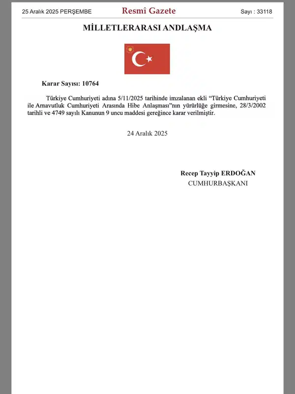 Türk Hava Yolları (THYAO), değeri 11,9 milyon dolar olarak hesaplanan ve uçuşa uygun durumdaki bir uçağını Arnavutluk Cumhuriyeti’ne bağışlama kararı aldı. Türkiye Cumhuriyeti ile Arnavutluk Cumhuriyeti arasında yapılan hibe protokolü, Resmi Gazete’de yayımlanarak yürürlüğe girdi.