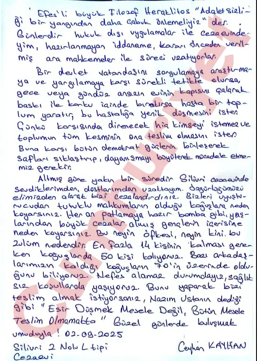 “Efes’li büyük Filozof Heraklitos “Adaletsizliği bir yangından daha çabuk önlemeliyiz” der. Günlerdir hukuk dışı uygulamalar ile cezaevindeyim, hazırlanmayan iddaname, kararı önceden verilmiş ara mahkemeler ile süreci uzatıyorlar. Bir devlet vatandaşını sorgulamaya, araştrmaya ve yargılamaya karşı sürekli tetikte olursa; gece veya gündüz ansızın evinin kapısını çalarak baskı ile korku içinde bırakırsa hasta bir toplum yaratır, bu hastalığa yenik düşmesini ister. Çünkü karşısında direnecek hiç kimseyi istemez ve toplumun tüm kesminin ona teslim olmasını ister. Buna karşı bütün demokrat güçlerin birleşerek safları sıklaştırıp, dayanışmayı büyüterek mücadele etmemiz gerekir. Altmış güne yakın bir süredir Silivri Cezaevi’nde sevdiklerimden, dostlarımdan uzaktayım. Özgürlüğümüzü elimizden alarak bizi cezalandırdınız. Bizleri uyuşturucudan tutuklu mahkumların olduğu koğuşlara neden koyarsınız? Her an patlamaya hazır bomba gibi, yaşlarından büyük cezalar almış gençlerin içerisine neden koyarsınız? Bu neyin öfkesi, neyin kini, bu zulüm nedendir? En fazla 14 kişinin kalması gereken koğuşlarda 50 kişi kalıyoruz. Bazı arkadaşlarımızın kaldığı koğuşların 70’in üzerinde olduğunu biliyoruz. Nefes alamaz durumdayız, sağlıksız koşullarda yaşıyoruz. Bunu yaparak bizi teslim almak istiyorsanız, Nazım Usta’nın dediği gibi ‘Esir düşmek mesele değil, bütün mesele teslim olmamakta.’ Güzel günlerde buluşmak umuduyla!”
