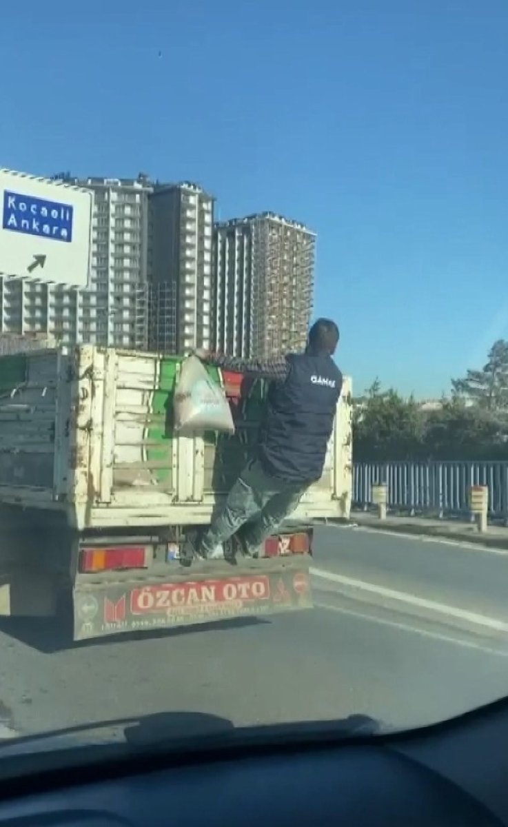İstanbul’un Tuzla ilçesinde D-100 karayolunda kamyonet kasasına tutunarak yolculuk eden vatandaşın umursamaz tavırları pes dedirtti.