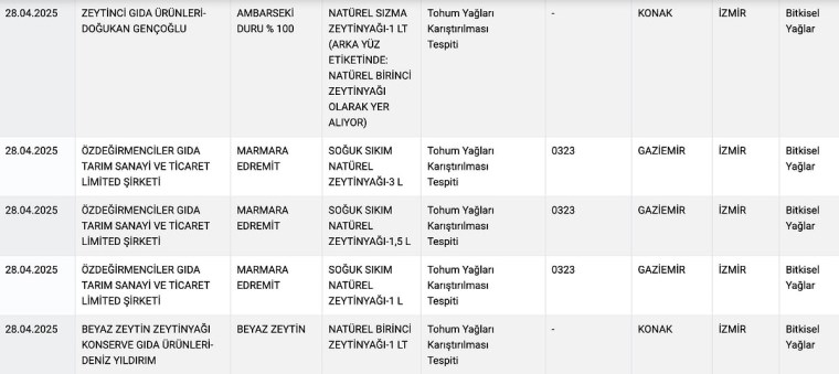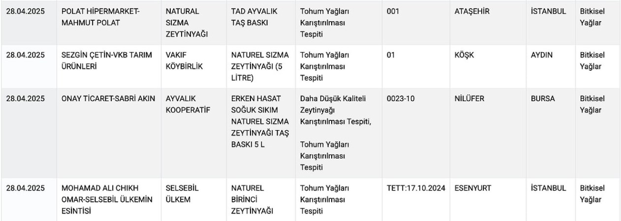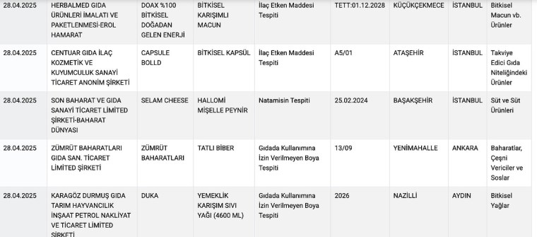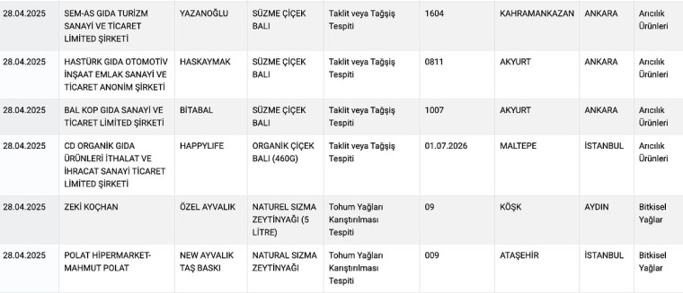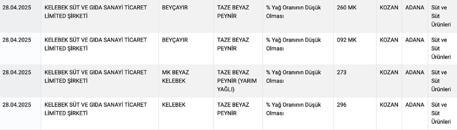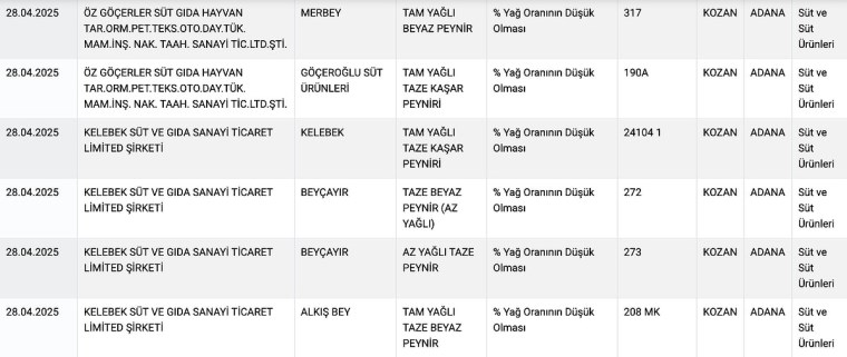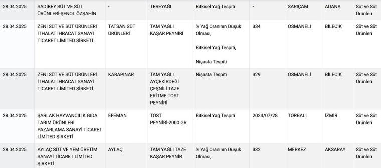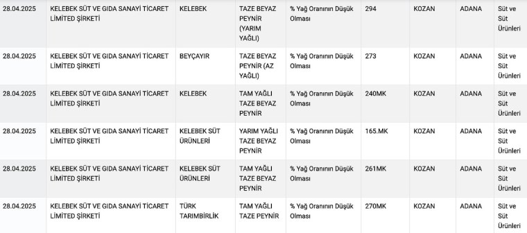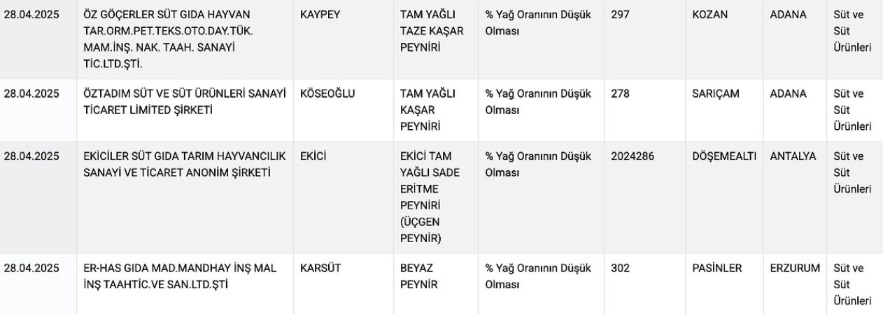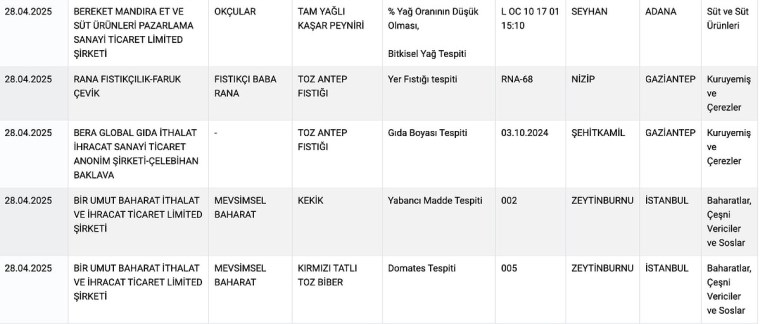 Tarım Bakanlığı’nın sitesinden yayımlanan yeni ifşalarda şu markalar ve ürünler yer aldı: