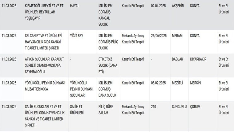 Konya’nın Selcan Et ve Et Ürünleri şirketinin Yiğit Bey markasının ısıl işlem görmüş piliç sucuğunda mekanik ayrılmış kanatlı etine rastlanırken, Kısmetoğlu Beyti Et ve Et Ürünleri şirketinin Hayal adlı markasının ısıl işlem görmüş kangal sucuğunda da kanatlı eti tespit edildi.