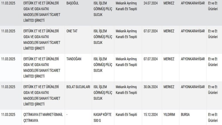 Afyonkarahisar’da Ertürk Et ve Et Ürünleri şirketinin Bolat Sucukları, One Tat, Başoğul ve Tandoğan markalarında mekanik ayrılmış kanatlı eti tespit edildi.