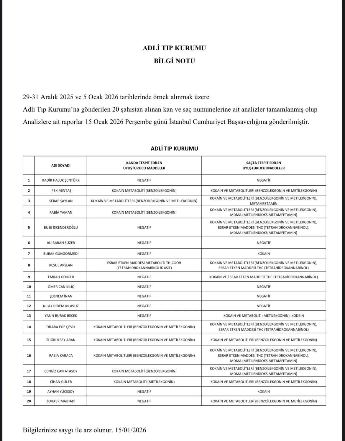 Sosyal medya ünlüsü Rabia Karaca, modacı Rabia Yaman, Les Benjamins’in direktörü Zohaer Majhadi, Miss Türkiye Güzeli Buse İskenderoğlu, fenomen Dilara Ege Çevik, Suma Han gece kulübü sahibi Cengiz Can Atasoy’un aralarında bulunduğu 15 kişinin uyuşturucu testi sonucu ‘pozitif’ çıktı.