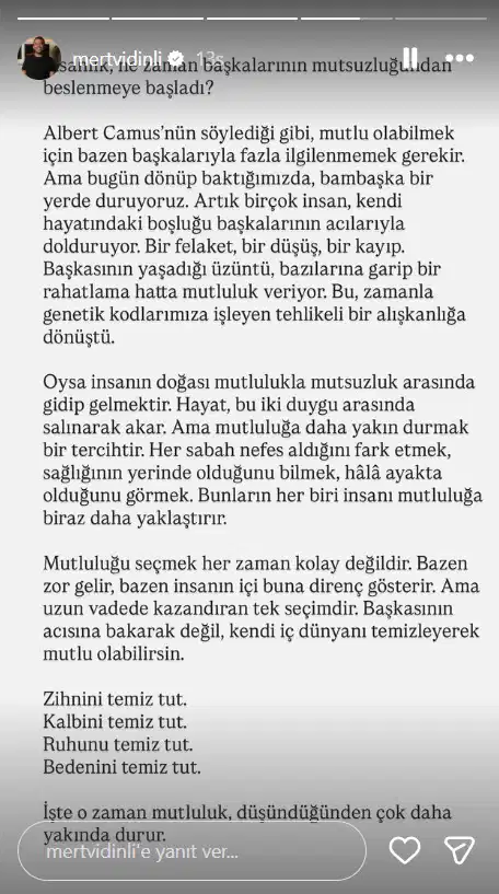 “Albert Camus’nün söylediği gibi, mutlu olabilmek için bazen başkalarıyla fazla ilgilenmemek gerekir. Ama bugün dönüp baktığımızda, bambaşka bir yerde duruyoruz. Artık birçok insan, kendi hayatındaki boşluğu başkalarının acılarıyla dolduruyor. Bir felaket, bir düşüş, bir kayıp. Başkasının yaşadığı üzüntü, bazılarına garip bir rahatlama hatta mutluluk veriyor. Bu, zamanla genetik kodlarımıza işleyen tehlikeli bir alışkanlığa dönüştü.