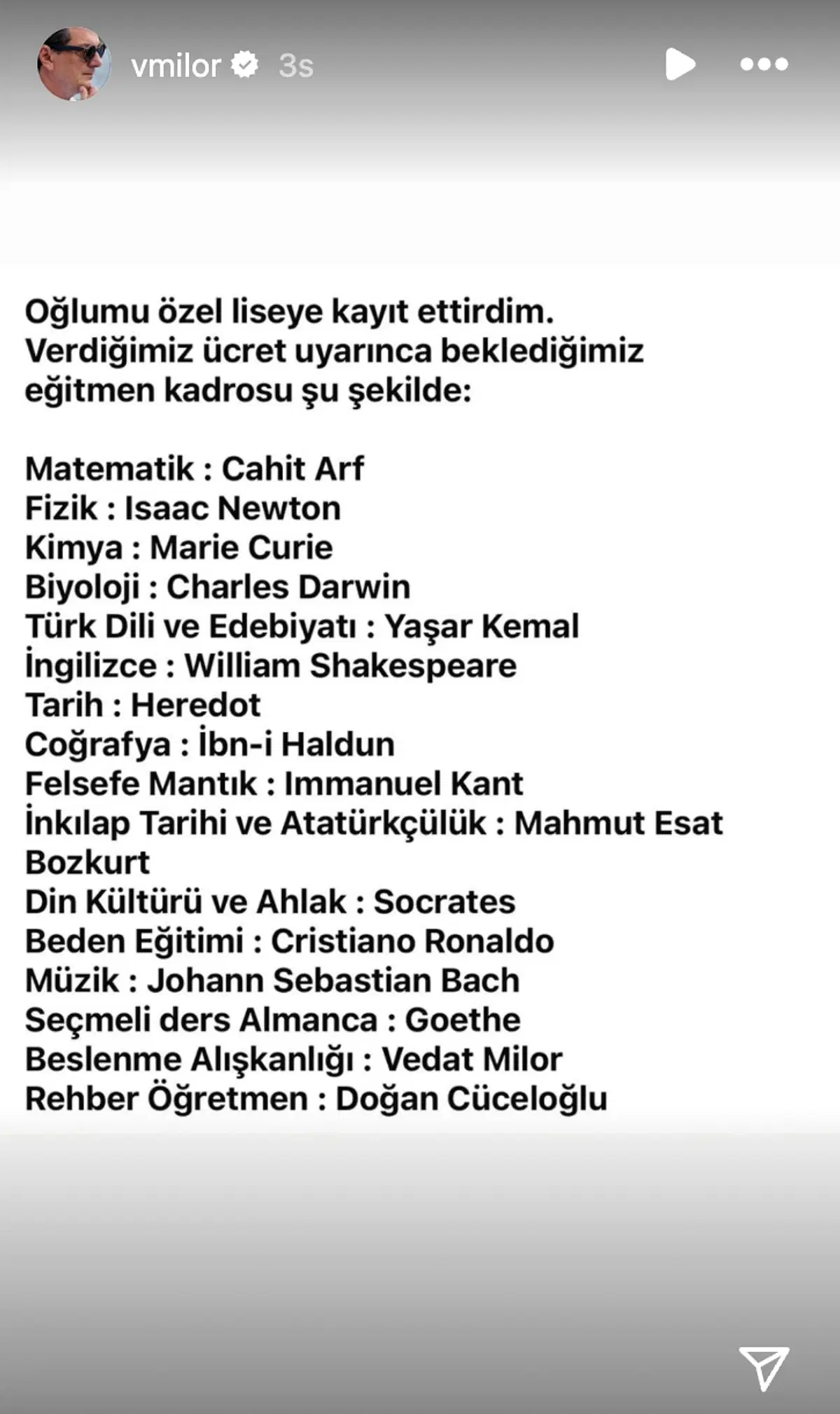 Milor, “Oğlumu özel liseye kaydettirdim” diyerek başladığı paylaşımında, özel okul ücretlerinin yüksekliğine değindi. Ücretin karşılığında beklentilerini esprili bir dille aktaran Milor, “Beklediğimiz eğitim kadrosu şu şekilde” ifadesini kullanarak ilginç bir yorumda bulundu.