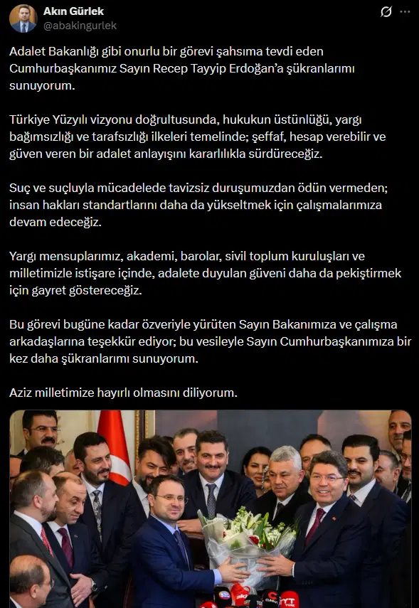 Yeni Adalet Bakanı Akın Gürlek, bir X (eski adıyla Twitter) hesabı da açtı.