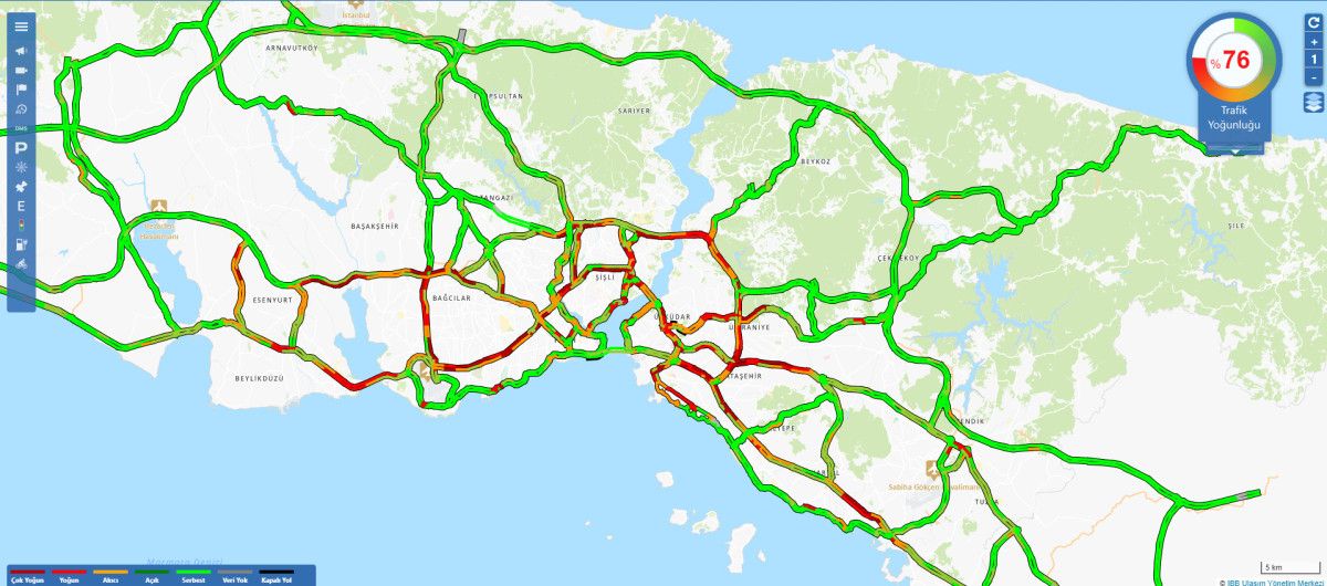 İstanbul Büyükşehir Belediyesi (İBB) Trafik Yoğunluğu Haritası’na göre saat 16.00 itibarıyla trafik yüzde 76 olarak ölçüldü.