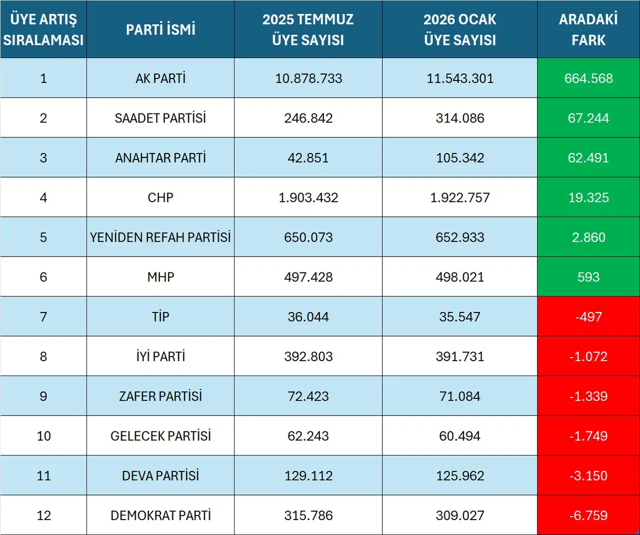 Verilere göre; CHP, Temmuz 2025’ten, Ocak 2026’ya kadar olan dönemde üye sayısını gözle görülür şekilde artırdı.