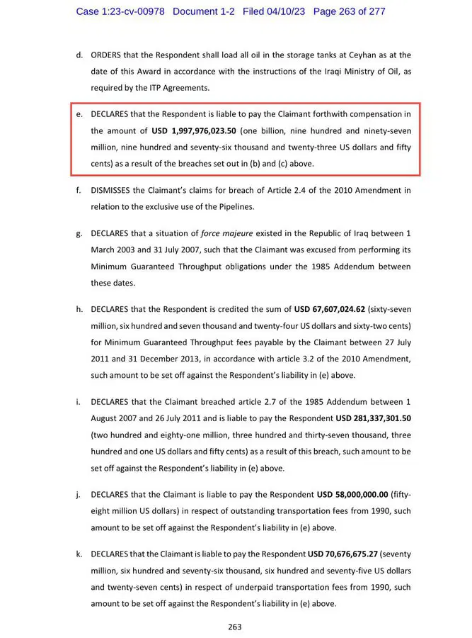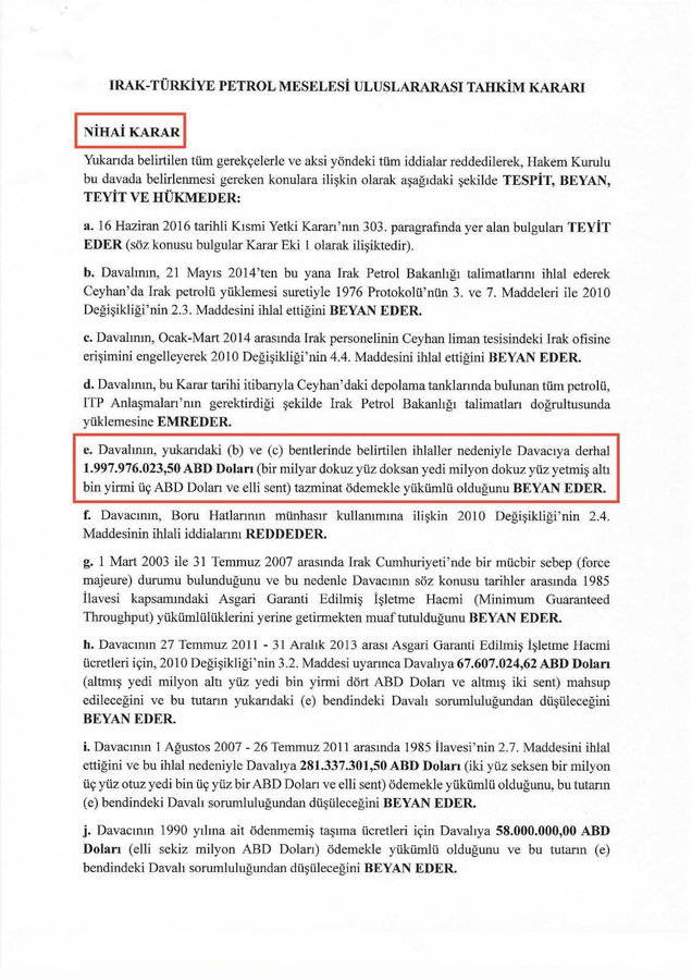 21 Mayıs 2014 – 30 Eylül 2018 döneminde yapılan izinsiz petrol taşımaları nedeniyle, Uluslararası Tahkim Mahkemesi Türkiye’ye 1 milyar 471 milyon dolar ceza verdi.
