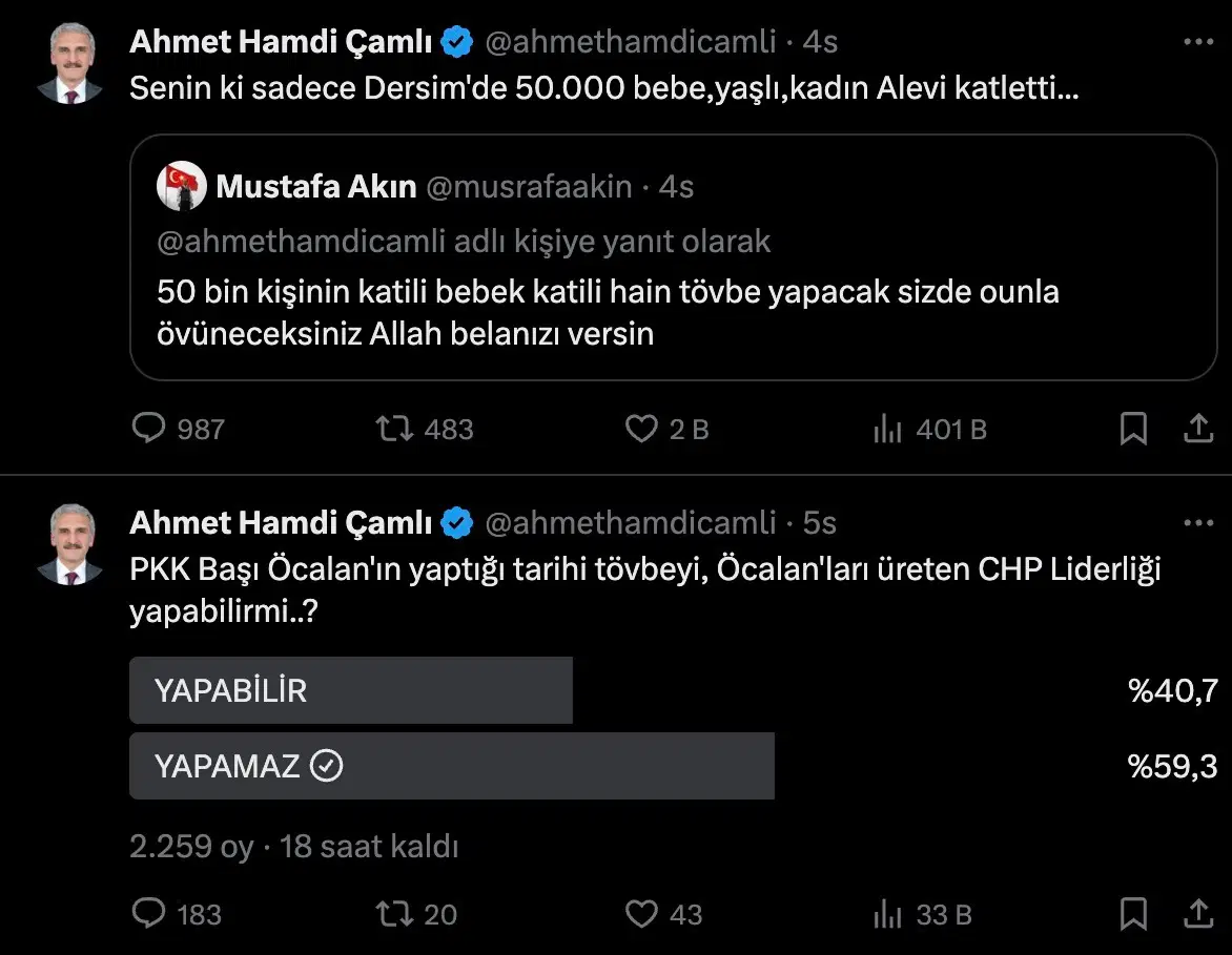 Ahmet Hamdi Çamlı ise takipçisine, “Seninki sadece Dersim’de 50.000 bebe, yaşlı, kadın Alevi katletti…” ifadeleriyle yanıt verdi.