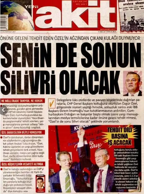 Akit’in manşetinde “Senin de sonun Silivri olacak!” ifadesi kullanıldı.