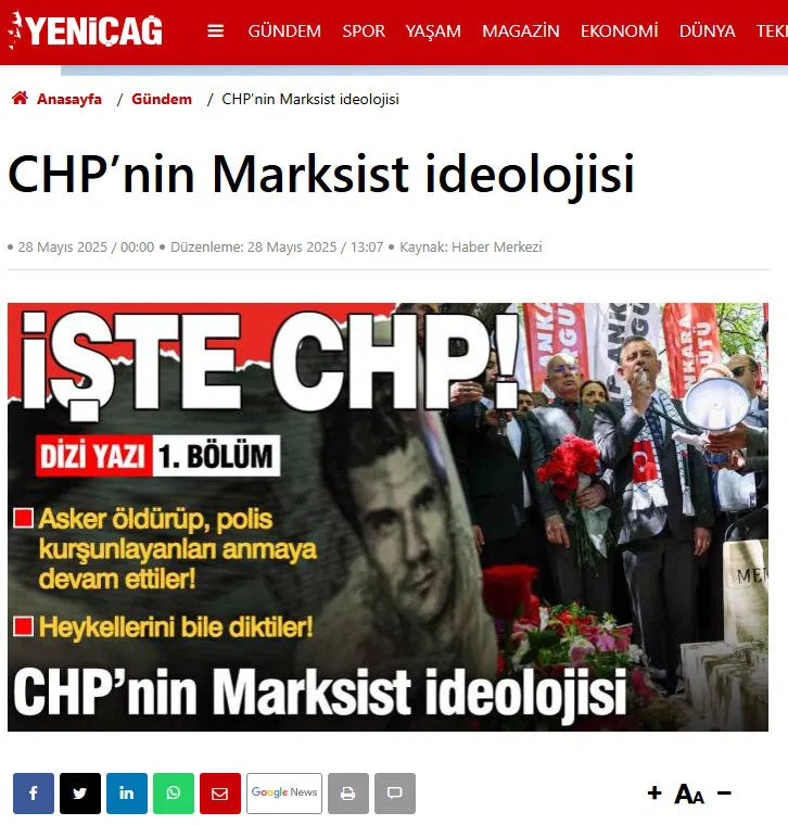 Milliyetçi çizgisiyle bilinen Yeniçağ gazetesi, “CHP’nin marksist ideolojisi” başlıklı bir yazı dizisi başlattı. Dizinin ilk bölümünde CHP’nin 68 Kuşağı’nın devrimci önderlerinden Deniz Gezmiş, Hüseyin İnan ve Yusuf Aslan için her sene anma düzenlemesi hedef alındı.