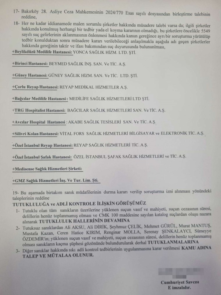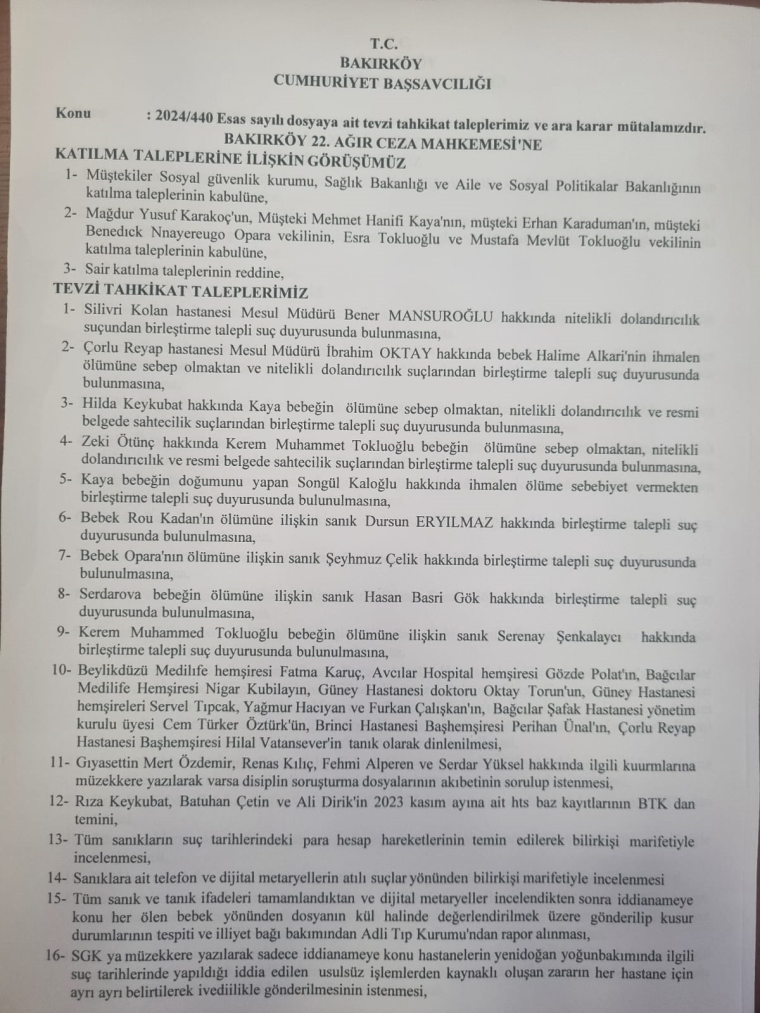 Savcı, Silivri Kolan Hastanesi Mesul Müdürü Bener Mansuroğlu hakkında dolandırıcılık suçundan, Çorlu Reyap Hastanesi Mesul Müdürü İbrahim Oktay hakkında Halime bebeğin ihmalen ölümüne sebebp olmak ve nitelikli dolandırıcılık suçlarından, Hilda Keykubad hakkında Kaya bebeğin ölümüne sebep olmaktan, nitelikli dolandırıcılık ve resmi belgede sahtecilik suçlarından, Zeki Ötünç hakkında Kerem Muhammed Tokluoğlu bebeğin ölümüne sebebp olmaktan, nitelikli dolandırıcılık ve resmi belgede sahtecilik suçlarından suç duyurusunda bulunulmasını talep etti.