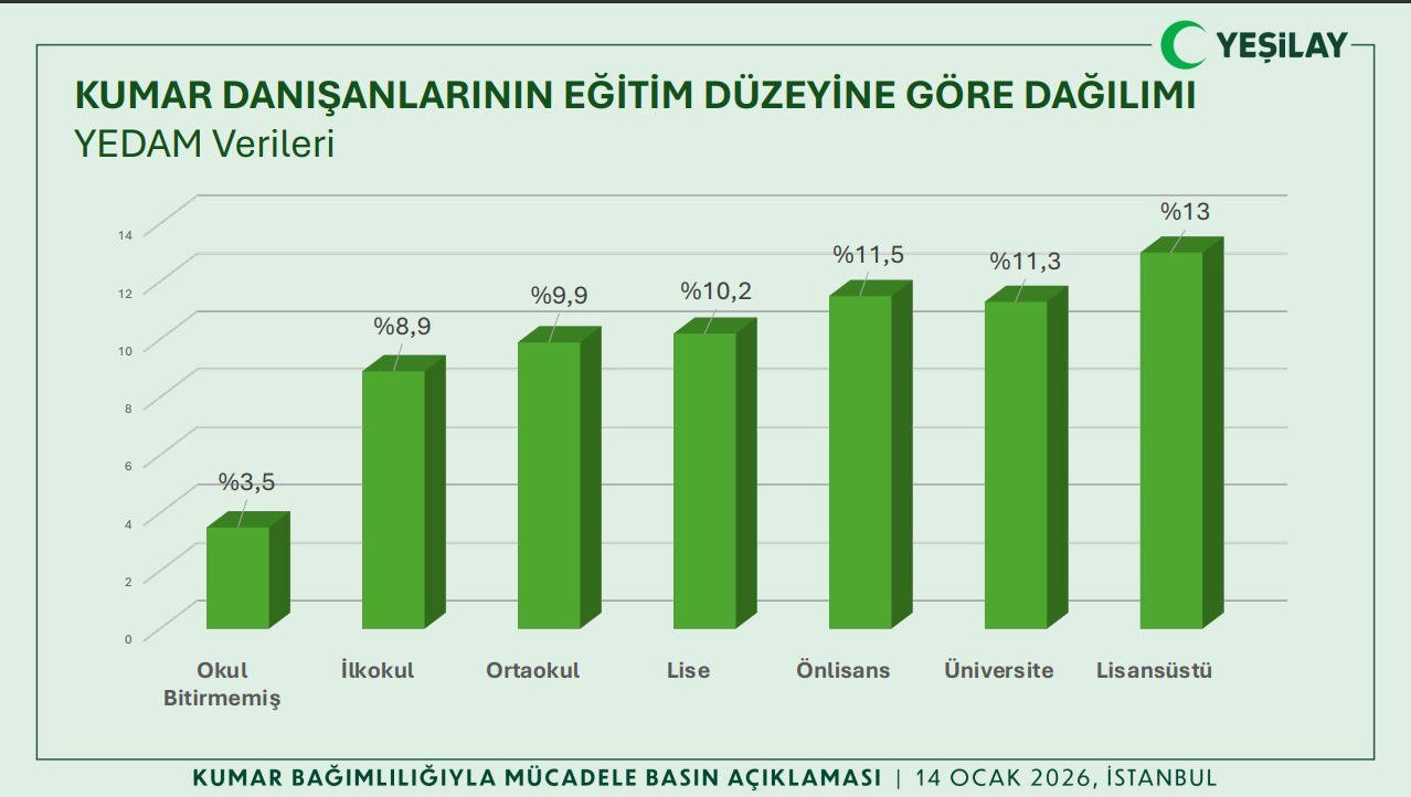 Yeşilay, kumar bağımlılığıyla mücadelede desteğe ihtiyaç duyan herkesi YEDAM Danışma Hattı 115 üzerinden ücretsiz ve gizlilik esasına dayalı hizmet almaya davet etti.