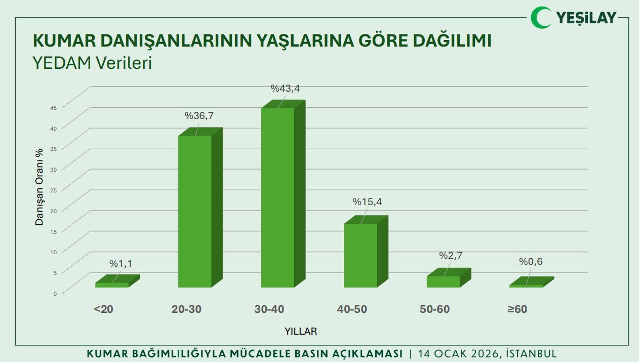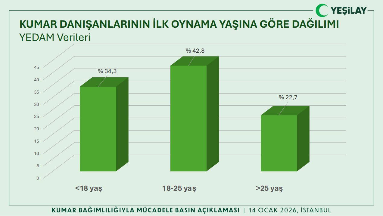 Başvuruların yaş dağılımı, bağımlılığın özellikle genç ve orta yaş grubunu etkilediğini ortaya koydu. Kumar oynayanların yüzde 36,7’si 20–30 yaş, yüzde 43,4’ü ise 30–40 yaş aralığında yer alıyor. 18 yaşından önce kumarla tanışanların oranı ise yüzde 34,3’e ulaştı.