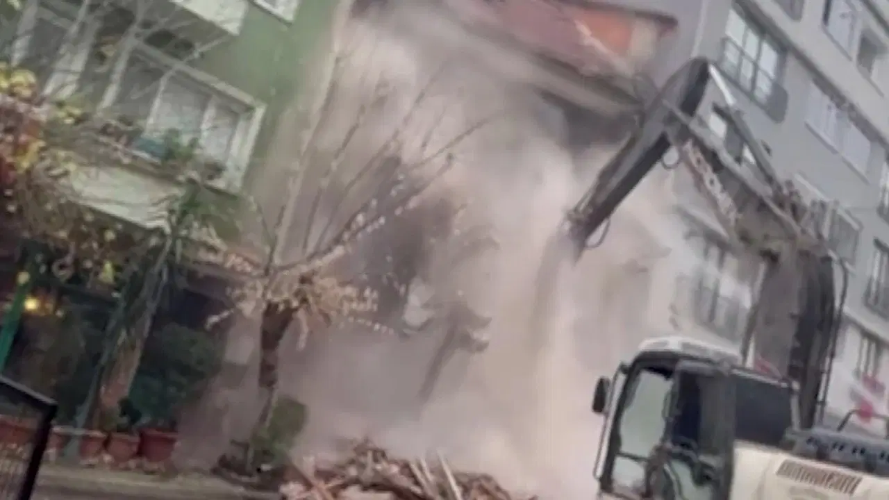 Binanın ilk 3 katı yıkılırken, son kat ise duvar ve kolonlar üzerinde ayakta kaldı. İş makinesinin darbesiyle son kat da yerle bir olurken, sokak toz bulutuyla kaplandı