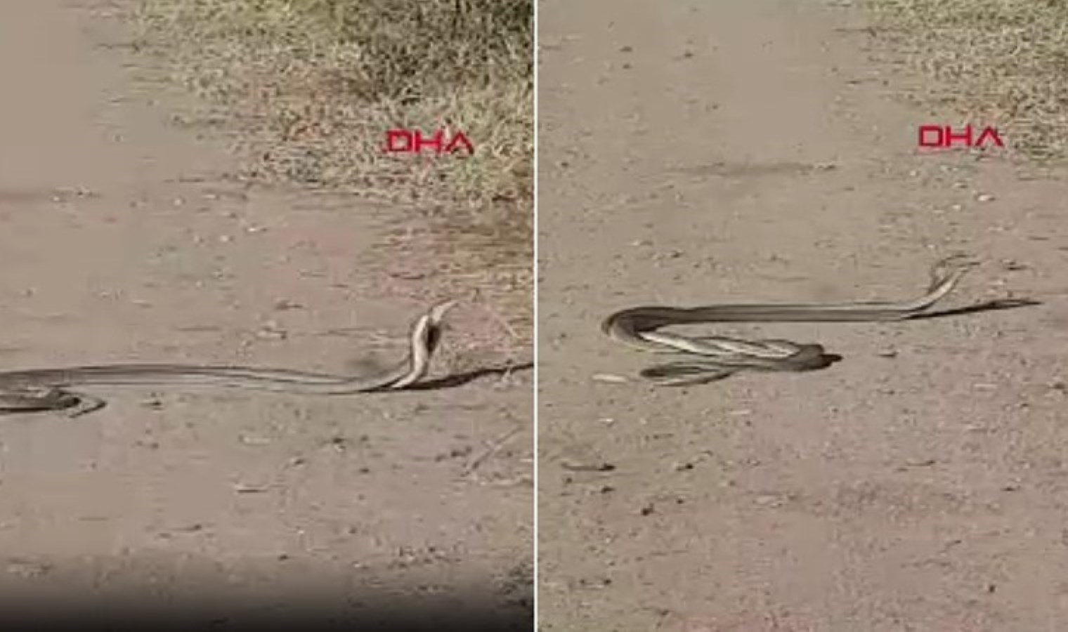 Görüntülerde yol üzerine ‘çiftleşme dansı’ yapan yılanlar bir süre sonra ortadan kayboldu.