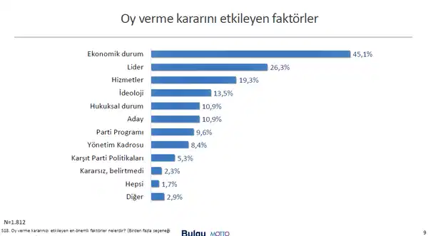 Yurttaşların oy verme kararını etkileyen faktörlere yönelik sorulan soru, halkın asıl gündemine ayna tuttu. Katılımcıların yüzde 45,1’i, “Ekonomik durumun” oy verme kararını etkilediğini ifade etti. Yüzde 26,3’lük kesim “liderin” oy verme kararında etkili olduğu yönünde fikir belirtirken, katılımcıların yüzde 19,3’ü “yapılan hizmetlerin” etkili olduğunu söyledi.
